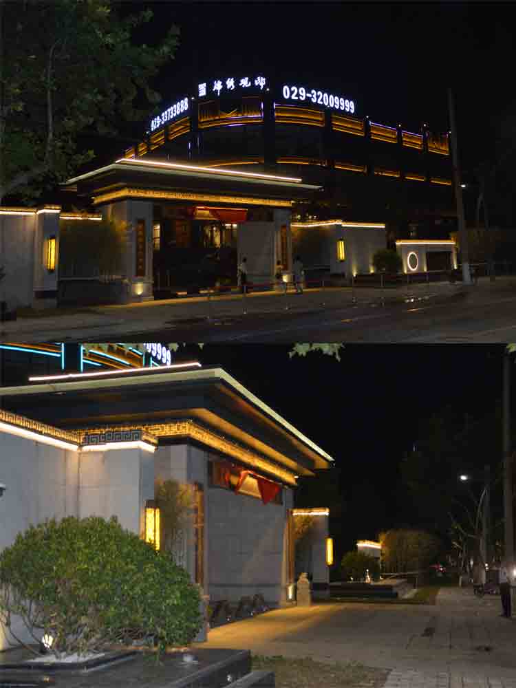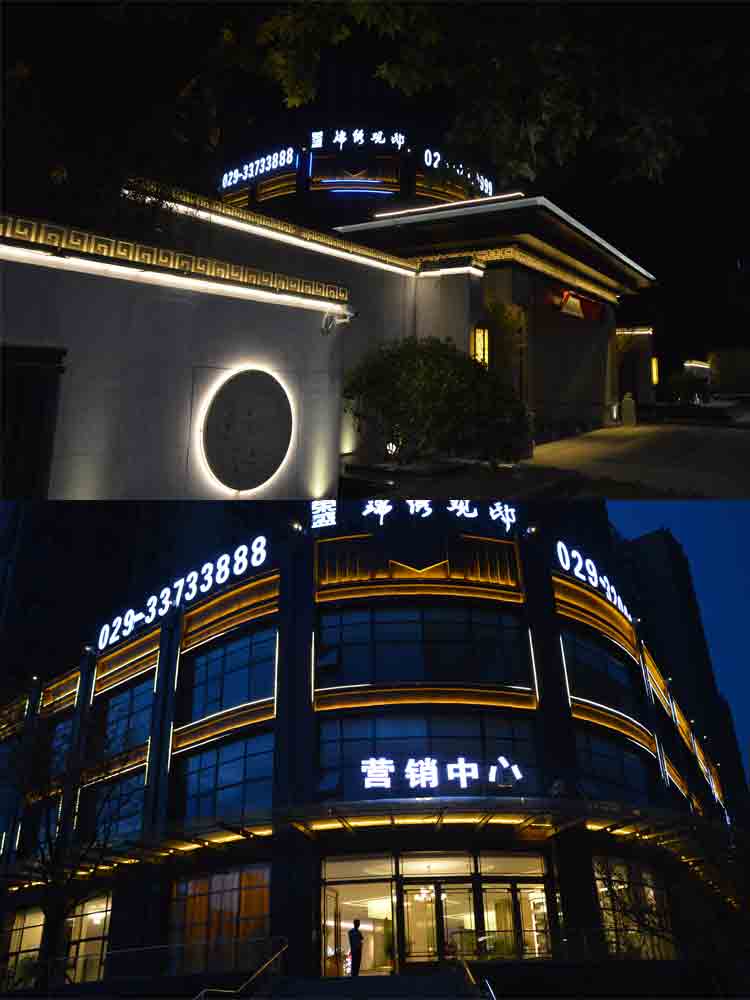 簡介—— 2018 榮盛景秀觀邸售樓部亮化,蘭光設計師根據(jù)其榮盛景秀觀邸售樓部商業(yè)屬性,商業(yè)照明設計明亮而醒目,營造商業(yè)經(jīng)營的夜景氛圍。以靜態(tài)的暖色燈光將其打亮,凸顯雅致。“榮盛景秀觀邸”標志以高亮度的燈光,吸引顧客注意,增強商業(yè)宣傳力度。景觀燈造型與建筑外立面造型完美融合,晚上光斑效果與綠植景觀交相輝映,相映成趣!榮盛景秀觀邸