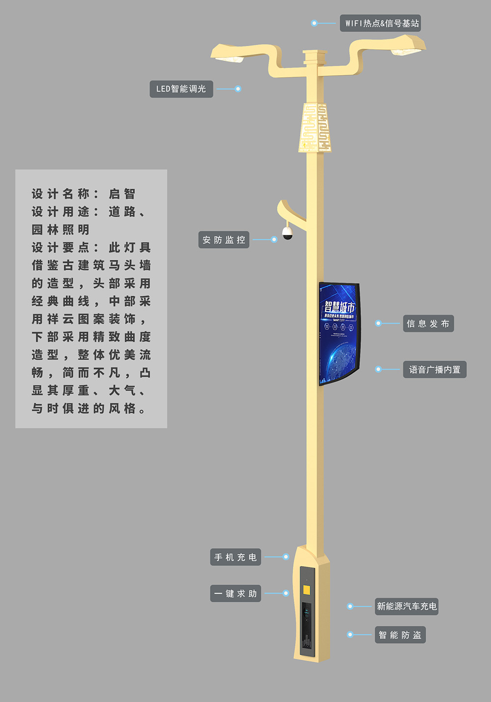 簡介—— 設計要點:此燈具借鑒古建筑馬頭墻的造型,頭部采用經典曲線,中部采用祥云圖案裝飾,下部采用精致曲度造型,整體優(yōu)美流暢,簡而不凡。 專利種類:外觀設計 專利號:ZL 2022 3 0032793.0